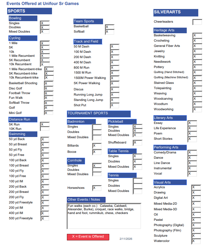 Unifour Senior Games: March 31-May 22, 2026 End date may be subject to change with addition of events.